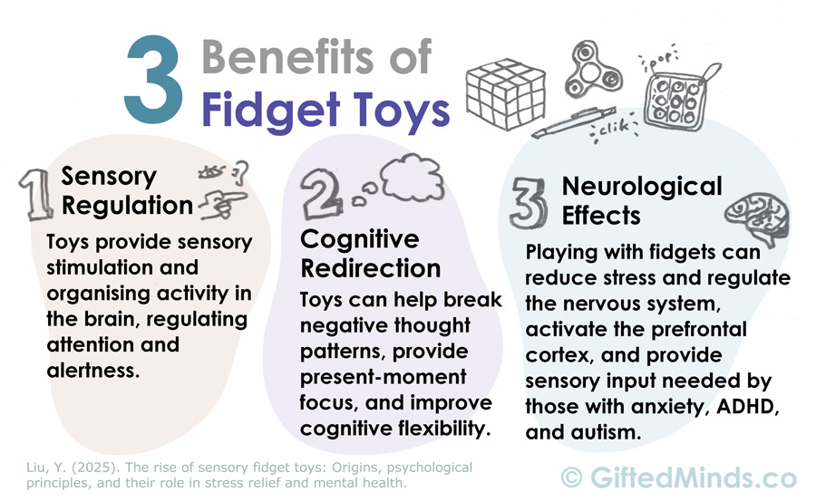 The research is showing that fidget toys benefit us through 3 mechanisms: sensory regulation, cognitive redirection, and neurological effects:
