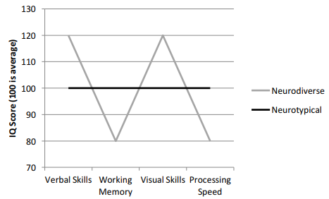 Another definition that has emerged for psychologists and educators describes neurodiversity as “within-individuals” as opposed to “between-individuals.” One way to understand this meaning of neurodiversity is to look at cognitive tests: A neurotypical brain may produce “flatter” distribution results across different cognitive abilities whereas a neurodiverse one produces a “spiky profile” that deviates more from normal distribution.